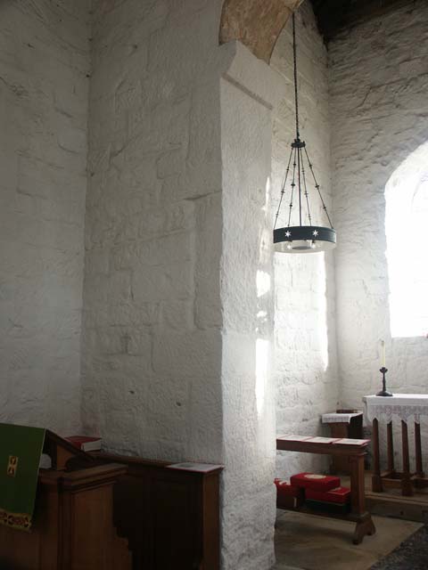 This general view of the interior shows that the chancel arch support also leans inwards. The arch itself is reconstructed from a roman arch, taken from the nearby fort of Binchester. It has a 12th Century fresco painted on it's underside.