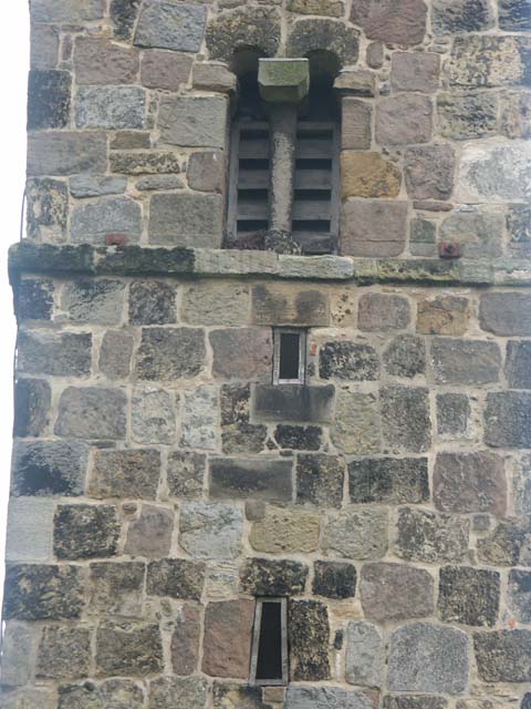 inside is the trace of a blocked door left of the south window.
